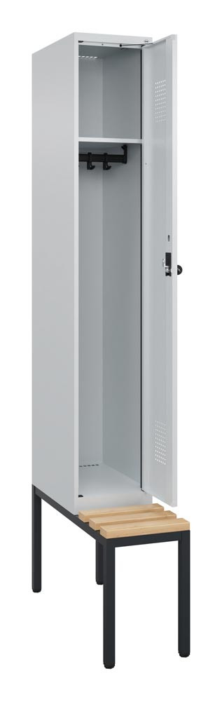 Garderobenschrank, untergeb. Sitzbank, Buche-Sitzleisten, 1 Abteil, Abt.B 300 mm, Drehriegel, BxTxH 300x500x2120 mm, Farbwahl EP559716