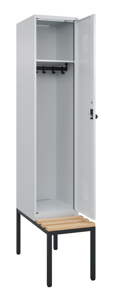 Garderobenschrank, untergeb. Sitzbank, Buche-Sitzleisten, 1 Abteil, Abt.B 300 mm, Drehriegel, BxTxH 300x500x2120 mm, Farbwahl EP559716