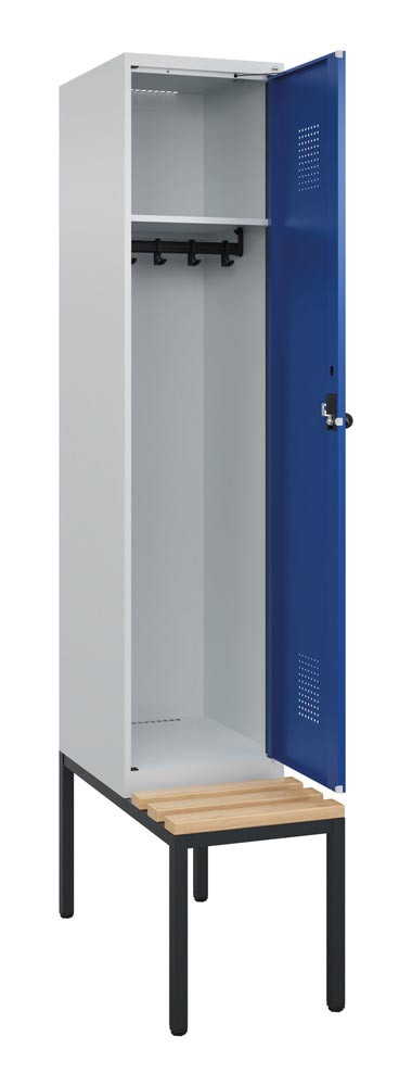 Garderobenschrank, untergeb. Sitzbank, Buche-Sitzleisten, 1 Abteil, Abt.B 400 mm, Drehriegel, BxTxH 400x500x2120 mm, RAL 7035/5010 EP559718