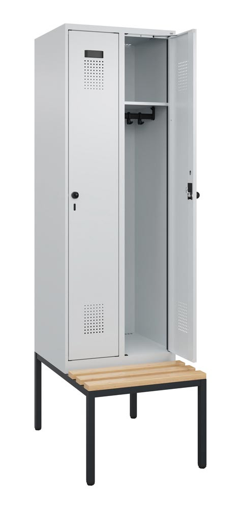 ∙ Stabile Stahlkonstruktion mit hochwertiger Einbrennbeschichtung ∙ Verstärkte Türen mit Anschlagsdämpfer für geräuscharmes Schließen ∙ Designlochbilder für optimale Belüftung ∙ Stabile Garderobenstange mit 3 verdrehsicherem Doppel-Schiebehaken ∙ Glatter Abteilboden für einfaches Auskehren ∙ Fußteil und Schrankboden serienmäßig verzinkt für erhöhten Korrisionschutz ∙ Innovative Kant- und Biege-Geometrien, sowie Materialdopplungen ∙ Fest verschweißter Ablageboden pro Abteil ∙ Optimierte Lüftungsöffnungen im Abteil · Korpus T 500 mm · Wahlweise 2-, 3- oder 4 Abteile · Sitzbankgestell H 420 mm · Sitzhöhe 450 mm, Sitztiefe 315 mm · Bank und Schrank werden zur einfachen Selbstmontage separat geliefert · Schuhroste sowie Kunststoff-SItzleisten in schwarzgrau oder weiß sind auf Anfrage erhältlich