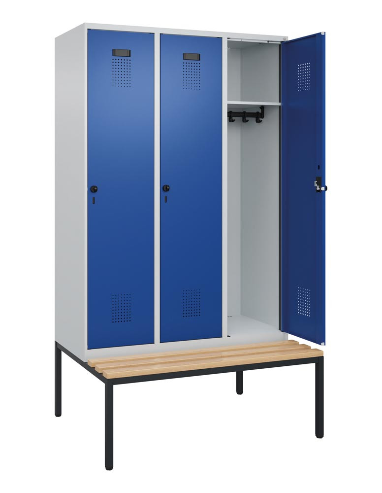 Garderobenschrank, untergeb. Sitzbank, Buche-Sitzleisten, 1 Abteil, Abt.B 400 mm, Drehriegel, BxTxH 400x500x2120 mm, RAL 7035/5010 EP559718