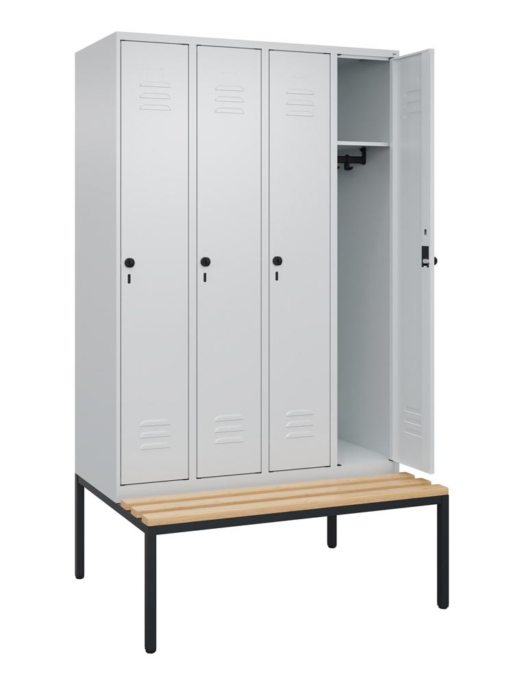 Garderobenschrank, untergeb. Sitzbank, BxTxH 1200x500x2120 mm, 4 Abteile, Abt.B 300 mm, Holzleisten, Drehriegel, RAL 7035
