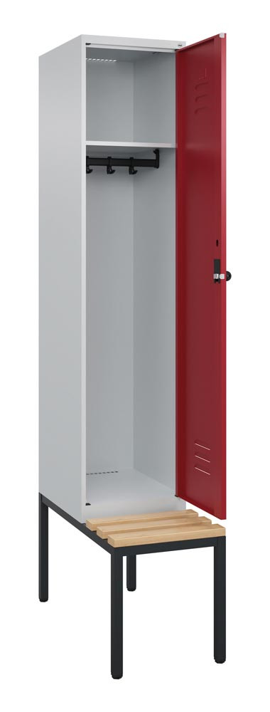 Garderobenschrank, untergeb. Sitzbank, BxTxH 400x500x2120 mm, 1 Abteil, Abt.B 400 mm, Holzleisten, Drehriegel, Farbwahl