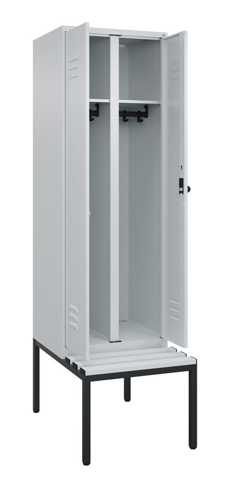 Garderobenschrank, untergeb. Sitzbank, BxTxH 600x500x2120 mm, 2 Abteile, Abt.B 300 mm, Kunststoffleisten, Drehriegel, Farbwahl EP559374
