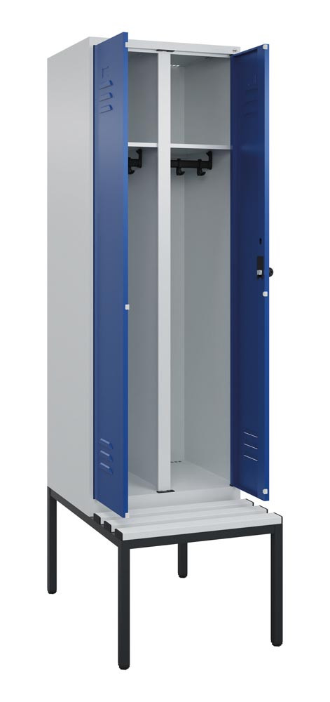 Garderobenschrank, untergeb. Sitzbank, BxTxH 600x500x2120 mm, 2 Abteile, Abt.B 300 mm, Kunststoffleisten, Drehriegel, Farbwahl EP559374