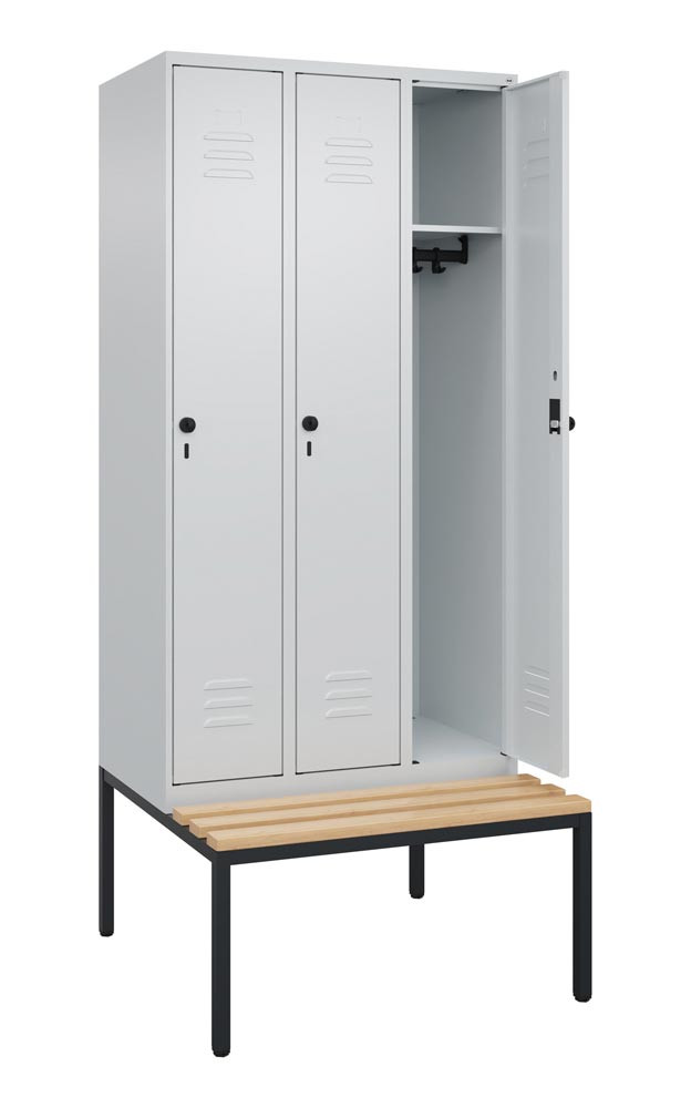 Garderobenschrank, untergeb. Sitzbank, BxTxH 900x500x2120 mm, 3 Abteile, Abt.B 300 mm, Holzleisten, Drehriegel, RAL 7035