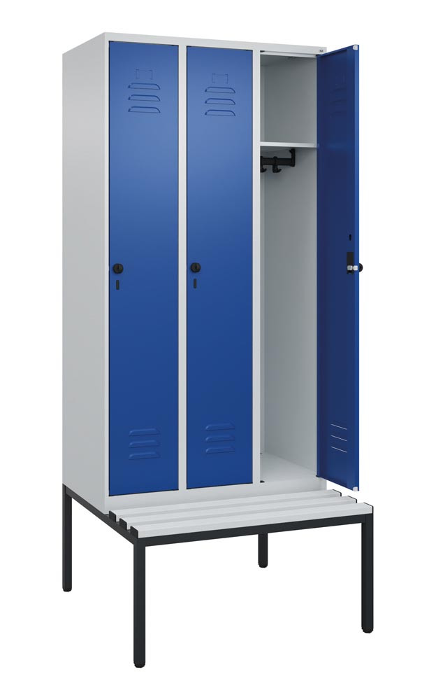 Garderobenschrank, untergeb. Sitzbank, BxTxH 900x500x2120 mm, 3 Abteile, Abt.B 300 mm, Kunststoffleisten, Drehriegel, RAL 7035/5010