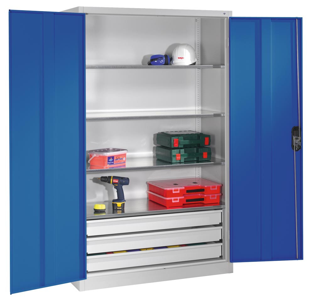 Großraum-Werkzeugschrank mit Vollblech-Flügeltüren, 3 Schubladen unten, 4 Verstellböden, BxTxH 930x600x1950 mm, RAL 7035/5010 EP533465