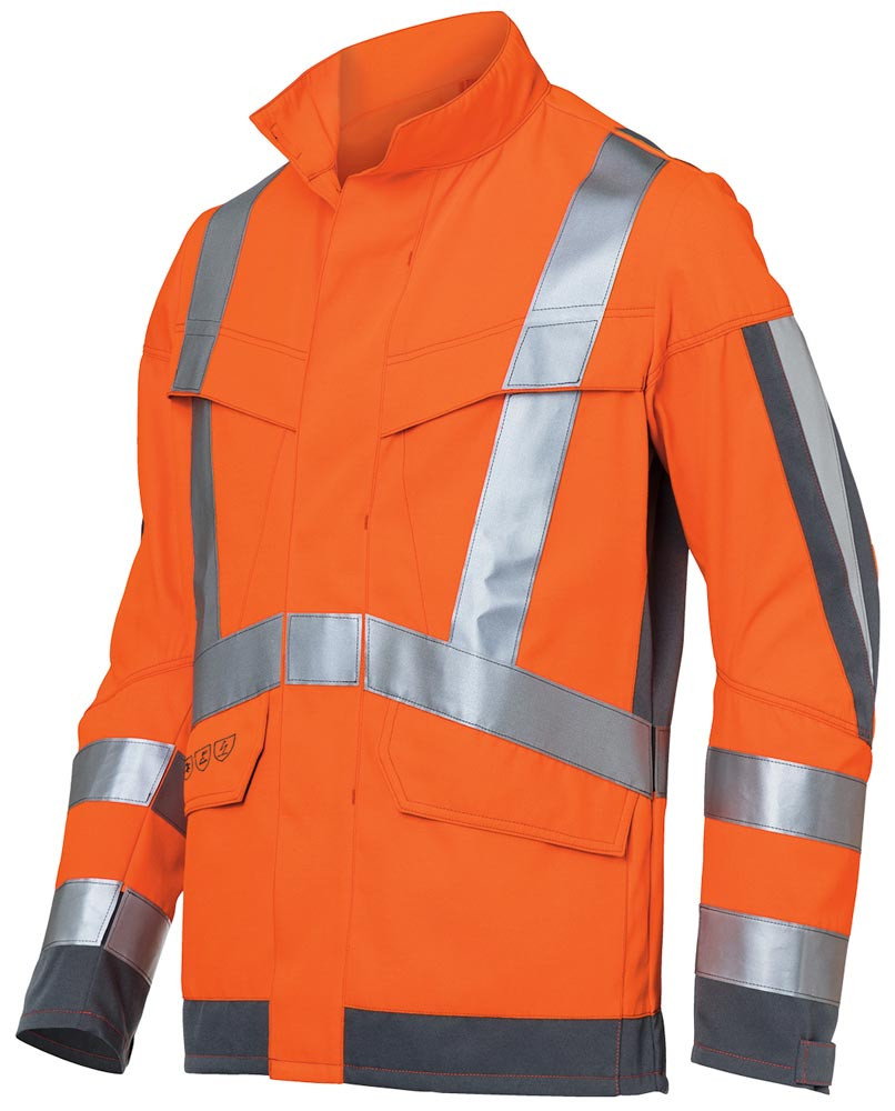 Nach EN ISO 11612:2015, EN ISO 11611:2015, EN 1149-5, EN ISO 20471+A1, IEC 61482-2 APC=1 und EN ISO 15797 ∙ Aus 36% Modacryl/33% Polyester/30% Aramid/1% Antistatische Faser, ca. 260 g/m2 ∙ Zwei Brusttaschen mit Patte ∙ Zwei Seitentaschen mit Patten und Klette ∙ Abgedeckter Front-Reißverschluss, Blende mit Druckknöpfen und Klette verschließbar ∙ Ergonomisch geschnittene Ärmel mit zusätzlichen Bewegungszonen für mehr Bewegungsfreiheit ∙ Verlängerter Rücken ∙ Optimale Sichtbarkeit