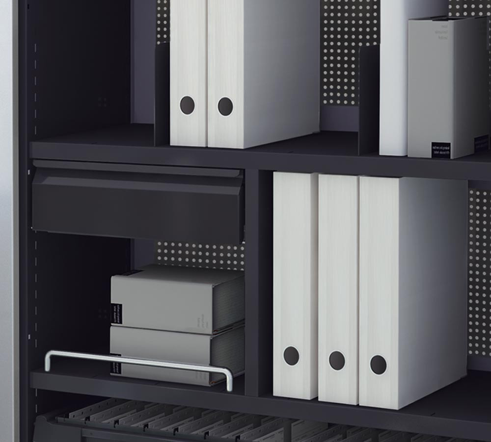 Kleinschublade, mit Gefach-Trennwand, graphitschwarz, Einbau unter Fachboden rechts in 2. OH, für Hochauszugschrank