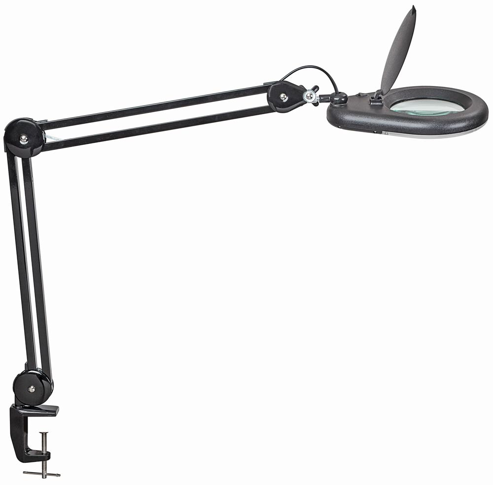 Kunststoff/Metall · mit Tischklemme oder Standfuß · Parallelogramm-Metallarm drehbar, neigbar · 3 Dioptrien-Echtglas-Linse (1,75-fache Vergrößerung), Ø 5″ (127 mm), Linsenfläche 144 cm² · Armlänge unten/oben 410 mm - Höhe 495 mm - (mit Tischklemme) · Armlänge unten/oben 310 mm - Höhe 482 mm - (mit Standfuß) · Betriebsspannung 220-240 V ″ Lichtfarbe 6.500 Kelvin - tageslichtweiß · gewichteter Energieverbrauch 8 kWh/1000 h · Lichtstrom 935 Lumen · Lebensdauer 50.000 Stunden · Effizienzklasse E (Spektrum A bis G)