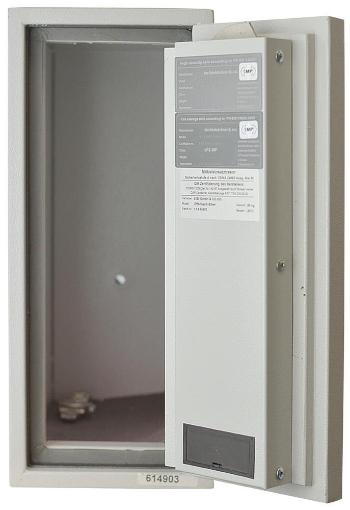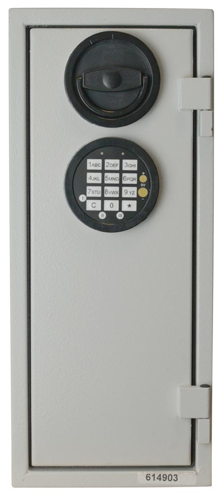 · Tür und Korpus mehrwandig · Durch spezielle Dichtungen und Füllstoffe feuersicher bis 840 °C · Türöffnung bis 180° möglich · Scharnierseite mit zusätzlichem Hintergreifprofil bietet zusätzliche Sicherheit · Beschlag und Scharniere 12 mm vorstehend · Klappgriff mit Doppelbartsicherheitsschloss und 2 Schlüsseln · Je zwei Bohrungen in Rückwand und Boden zur Befestigung · Lackierung in RAL 7035 lichtgrau · Zahlenschloss (wie abgebildet) gegen Aufpreis