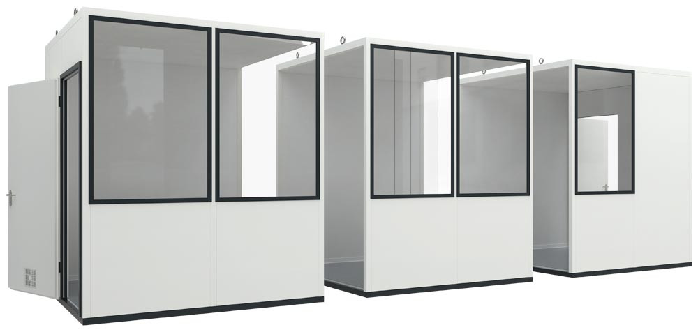 Mit einer standardisierten Bauform, die in vier verschiedenen Größen verfügbar ist, und drei zugeschnittenen Elektropaketen, ermöglicht unser innovatives Raumsystem eine kosteneffiziente und schnelle Umsetzung, sobald der Bedarf entsteht. Dank seiner Mobilität lässt sich das ganze System mit Leichtigkeit mittels Gabelstapler oder Kran genau dorthin bewegen, wo Sie ihn brauchen. Der Mehrzweckraum sorgt für maximale Flexibilität, um Ihren Raumansprüchen jederzeit gerecht zu werden.