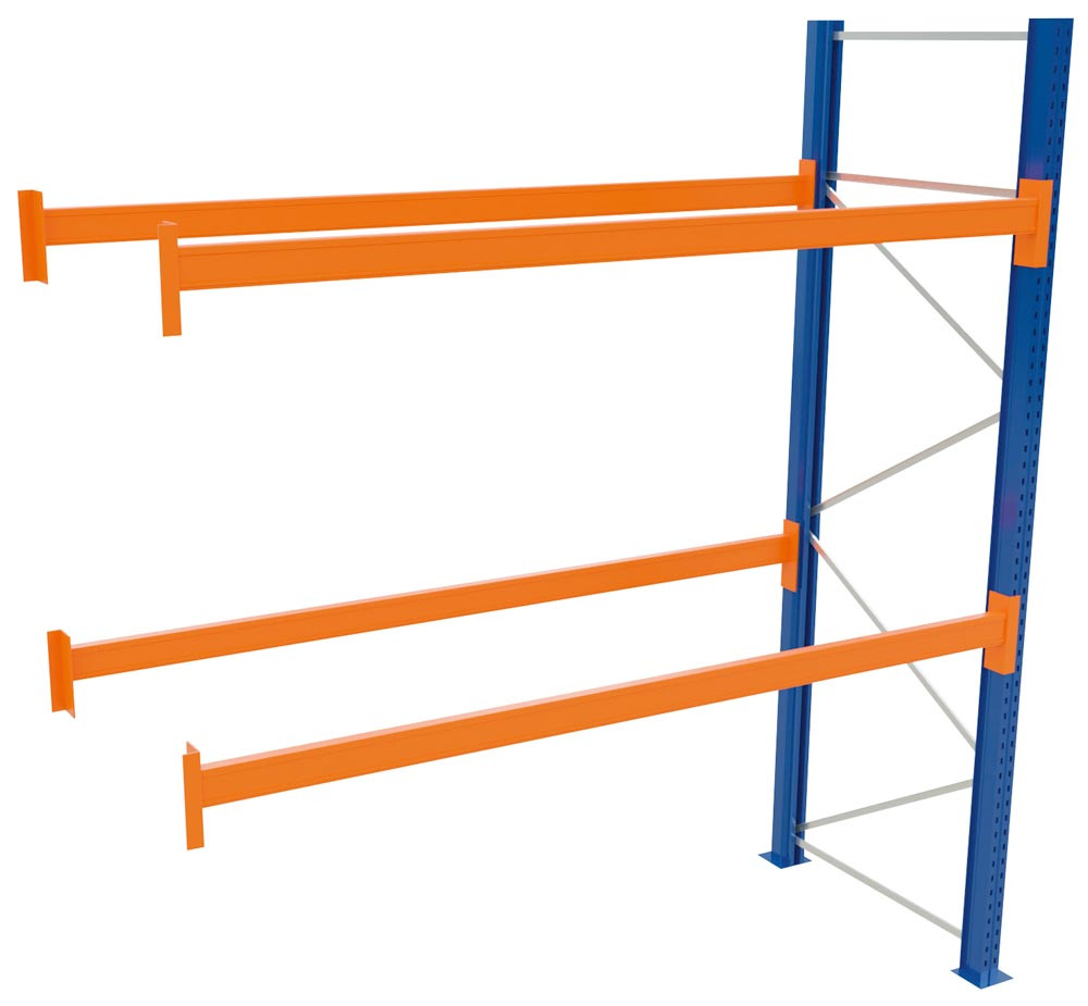 Palettenregal, Anbaufeld, BxTxH 2786x1100x4000 mm, 3 Lagerebenen, Fachlast 2400 kg, Feldlast 5287 kg, Rahmen blau, Holme reinorange EP539888