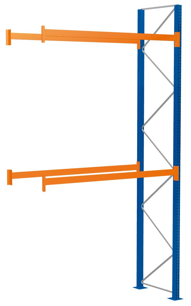 Palettenregal, Anbaufeld, BxTxH 2786x2200x5000 mm, 3 Lagerebenen, Fachlast 1500 kg, Feldlast 4582 kg, Rahmen blau, Holme reinorange EP539883