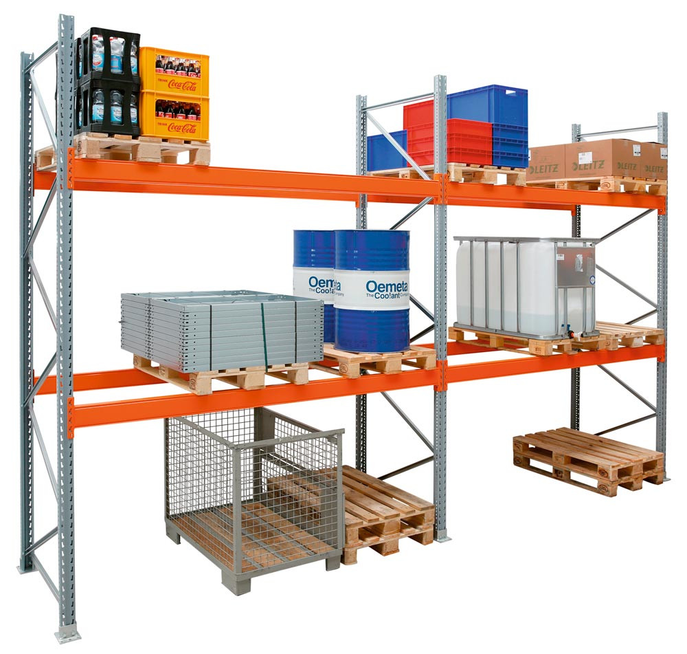 Palettenregal, Grundfeld, 2 Lagerebenen, Fachlast 3000 kg, Feldlast 6000 kg, BxTxH 1900x1100x2500 mm
