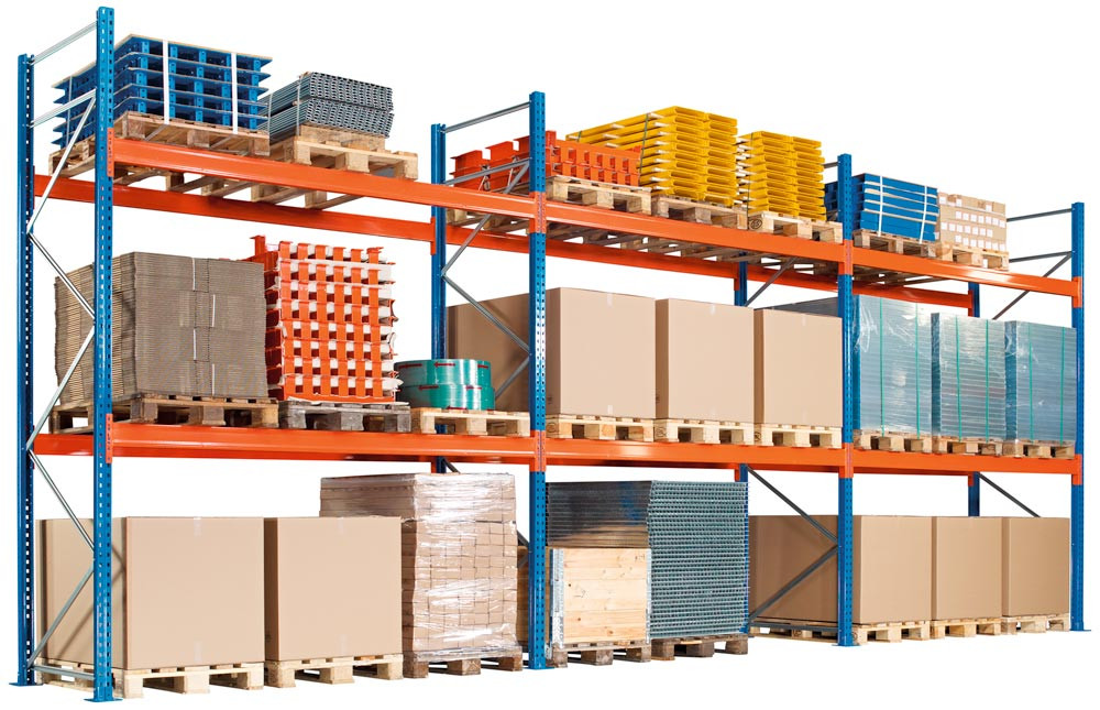 Palettenregal-Set, BxTxH 8444x1100x4000 mm, 3 Lagerebenen, Fachlast 1500 kg, Feldlast 5287 kg, Rahmen blau, Holme reinorange EP539879