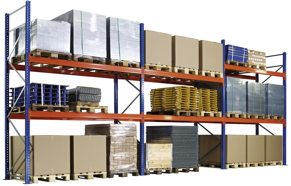 Palettenregal-Set, BxTxH 8444x1100x4000 mm, 3 Lagerebenen, Fachlast 1500 kg, Feldlast 5287 kg, Rahmen blau, Holme reinorange EP539879