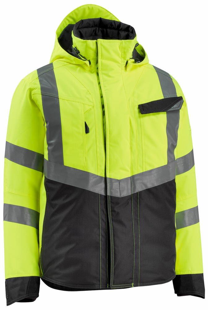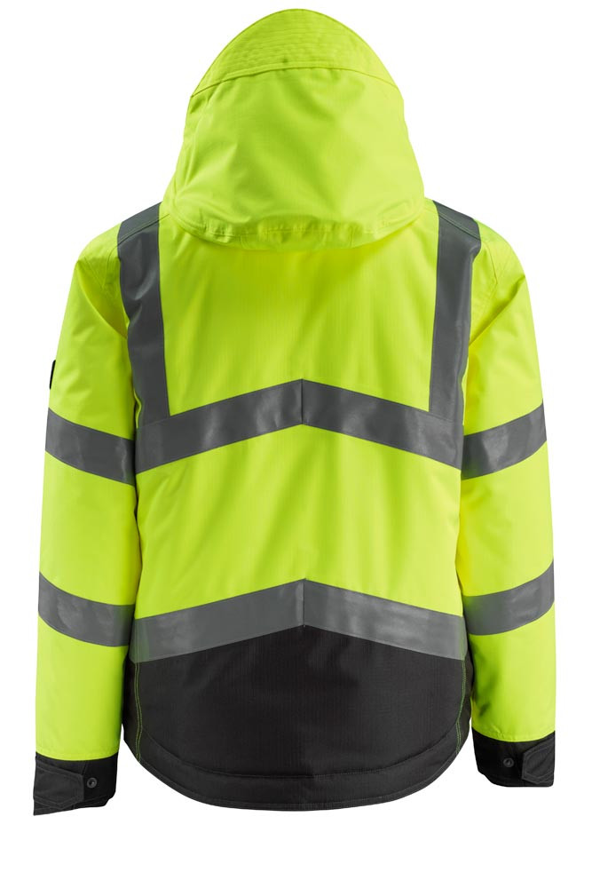 Nach EN ISO 20471 - Klasse 3, EN 343 3/1, 342 3/WP (1,96 clo) und Hi-Vis Gruppe A ∙ Aus 100% Polyester, ca. 210 g/m2 ∙ Atmungsaktiv, wind- und wasserdicht ∙ Nähte sind verklebt ∙ Stehkragen ∙ Kapuze, abnehmbar, gefüttert und mit Elastikschnüren regulierbar ∙ Futter aus Stepp ∙ Reißverschlussinnentaschen speziell für Handys entwickelt, mit Öffnung sowie Schlaufen für das Kopfhörerkabel ∙ Tasche mit Reißverschluss unter der Wetterschutzleiste, mit Platz für ein 9,4 Zoll Tablet ∙ Brusttasche mit Reißverschluss, Patte und Druckknopf ∙ D-Ring ∙ Ergonomisch geschnittene Ärmel ermöglichen hohe Bewegungsfreiheit ∙ Vordertaschen mit Reißverschluss ∙ Innen verstellbares Zugband in Hüfthöhe ∙ Reißverschluss im Futter am Rücken zum Anbringen eines Logos/einer Stickerei ∙ Rücken ist verlängert ∙ Wasserdichte Stifttasche ∙ Rippenbündchen (verdeckt unter der Wetterschutzleiste) an den Handgelenken ∙ Manschetten mit Verstärkungen aus CORDURA®-Gewebe und Druckknopfverschluss ∙ Für Industriewäsche-Kategorie B3 geeignet ∙ Zertifiziert nach OEKO-TEX® Standard 100