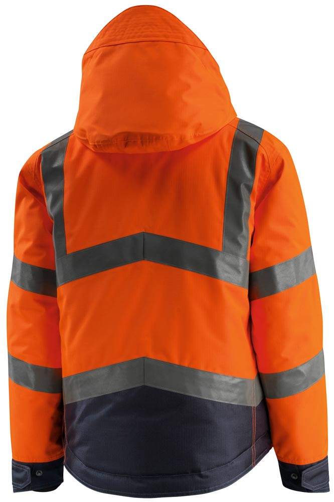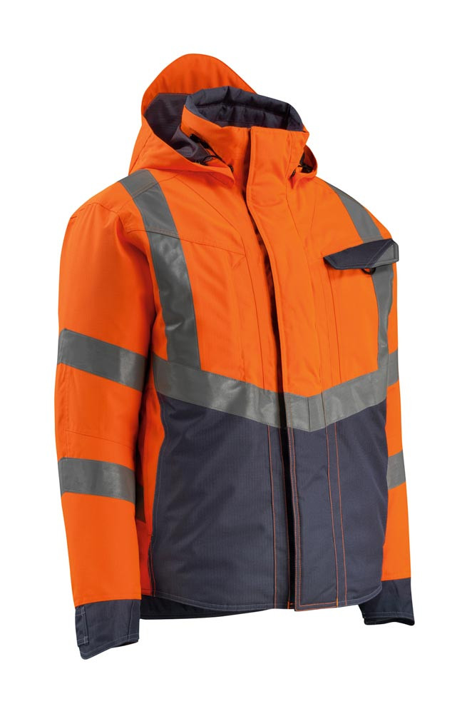 Nach EN ISO 20471 - Klasse 3, EN 343 3/1, 342 3/WP (1,96 clo) und Hi-Vis Gruppe A ∙ Aus 100% Polyester, ca. 210 g/m2 ∙ Atmungsaktiv, wind- und wasserdicht ∙ Nähte sind verklebt ∙ Stehkragen ∙ Kapuze, abnehmbar, gefüttert und mit Elastikschnüren regulierbar ∙ Futter aus Stepp ∙ Reißverschlussinnentaschen speziell für Handys entwickelt, mit Öffnung sowie Schlaufen für das Kopfhörerkabel ∙ Tasche mit Reißverschluss unter der Wetterschutzleiste, mit Platz für ein 9,4 Zoll Tablet ∙ Brusttasche mit Reißverschluss, Patte und Druckknopf ∙ D-Ring ∙ Ergonomisch geschnittene Ärmel ermöglichen hohe Bewegungsfreiheit ∙ Vordertaschen mit Reißverschluss ∙ Innen verstellbares Zugband in Hüfthöhe ∙ Reißverschluss im Futter am Rücken zum Anbringen eines Logos/einer Stickerei ∙ Rücken ist verlängert ∙ Wasserdichte Stifttasche ∙ Rippenbündchen (verdeckt unter der Wetterschutzleiste) an den Handgelenken ∙ Manschetten mit Verstärkungen aus CORDURA®-Gewebe und Druckknopfverschluss ∙ Für Industriewäsche-Kategorie B3 geeignet ∙ Zertifiziert nach OEKO-TEX® Standard 100