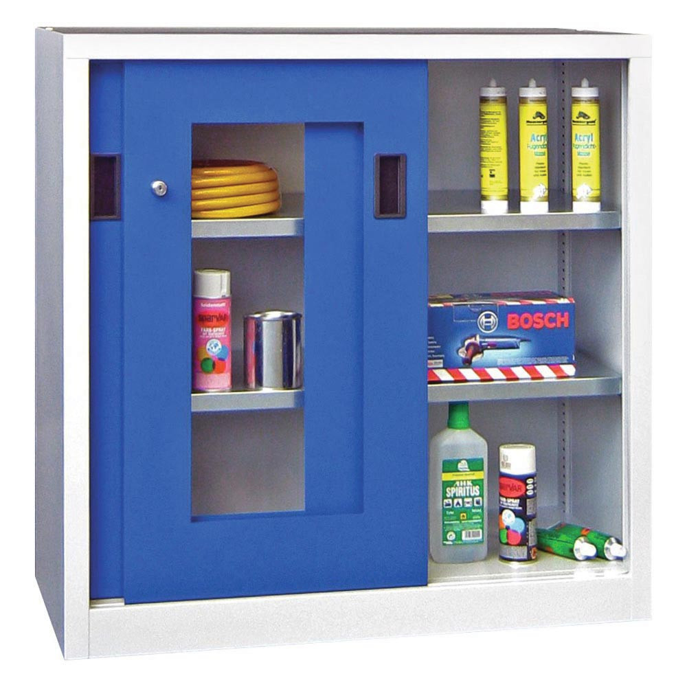 Schiebetürenschrank, Sichtfenstertüren, 2 verzinkte Böden, ohne Trennwand, BxTxH 1000x600x1000 mm, RAL 7035/5010