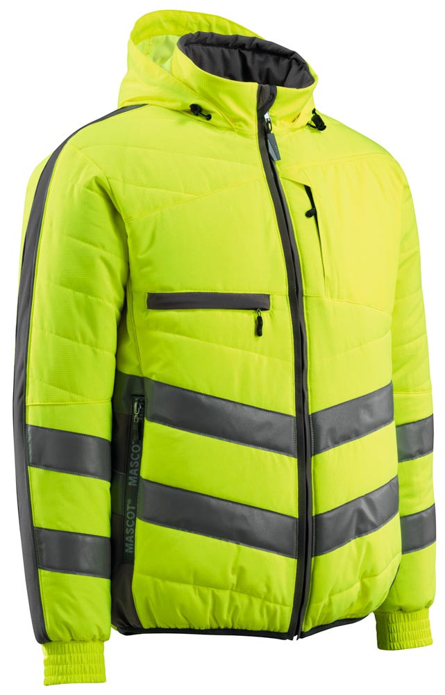 Nach EN ISO 20471 - Klasse 2 und Hi-Vis Gruppe A ∙ Aus 100% Polyester, ca. 300 g/m2 ∙ Atmungsaktiv, winddicht und wasserabweisend ∙ Wattiert mit Polyesterfüllung ∙ Verschluss mit Reißverschluss und inwendiger Wetterschutzleiste ∙ Kapuze kann zusammengefaltet und im Kragen untergebracht werden ∙ Reißverschlussinnentasche speziell für Handys entwickelt, mit Öffnung sowie Schlaufen für das Kopfhörerkabel ∙ Brusttaschen mit Reißverschluss ∙ D-Ring ∙ Stifttasche ∙ Vordertaschen mit Reißverschluss ∙ Für Industriewäsche-Kategorie C1 geeignet ∙ Zertifiziert nach OEKO-TEX® Standard 100