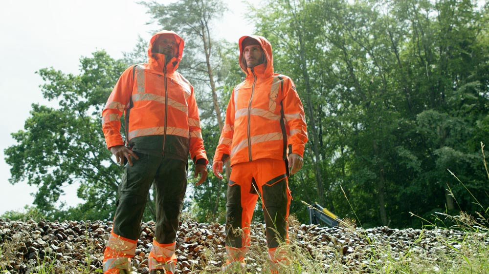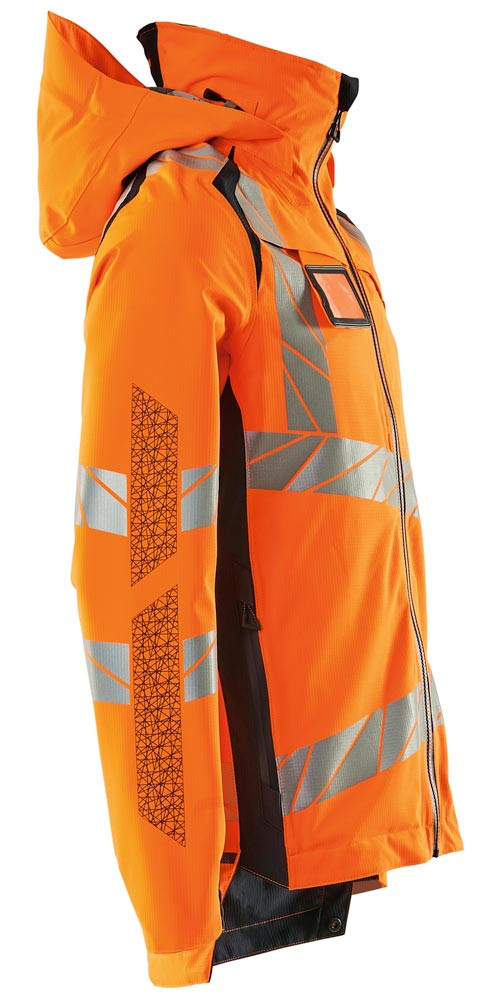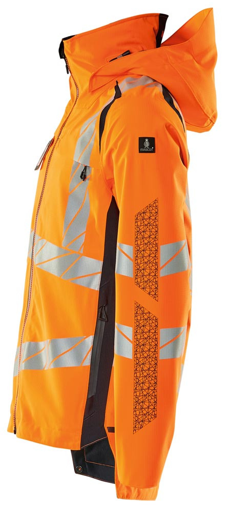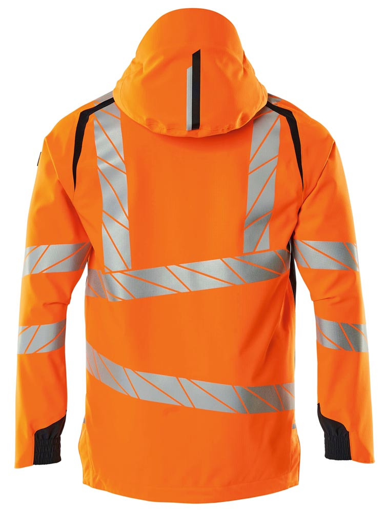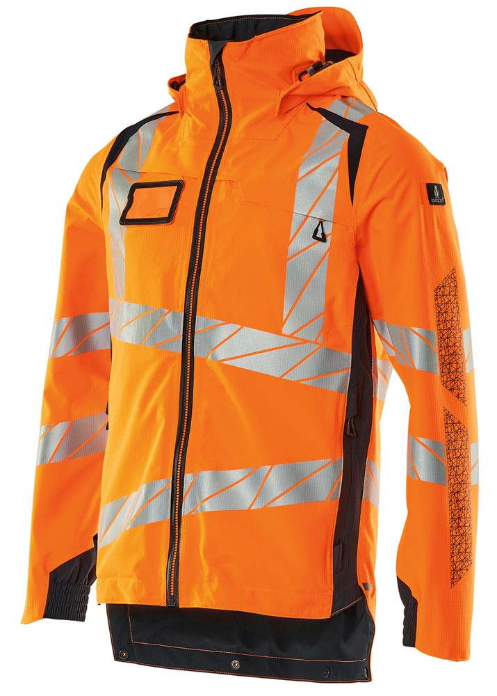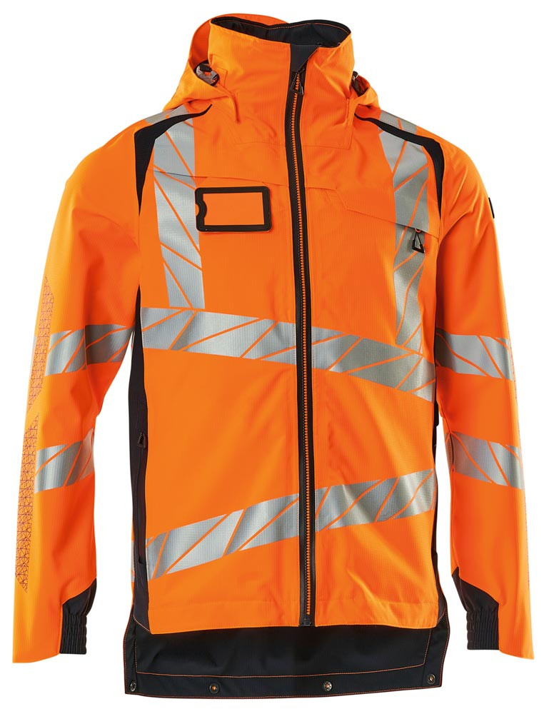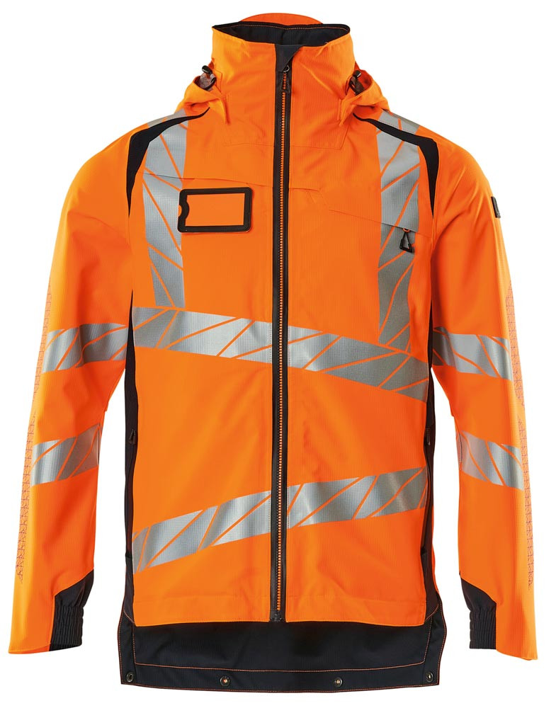 Nach EN ISO 20471 - Klasse 3 (Größe S - Klasse 2), Hi-Vis Gruppe A und EN 343 4/4/X:2019 ∙ Aus 100% Polyester, ca. 210 g/m2 ∙ Atmungsaktiv, wind- und wasserdicht ∙ Fluoreszierend und mit Reflexschulterstreifen sowie schrägverlaufenden Reflexen ∙ Zweifarbig ∙ Nähte sind verklebt ∙ Kapuze ist abnehmbar, gefüttert und mit verstellbaren Elastikschnüren versehen ∙ Verschluss mit wasserdichtem Reißverschluss und inwendiger Wetterschutzleiste ∙ Innentaschen - zwei mit Reißverschluss sowie eine offene aus Netzmaterial ∙ Abnehmbarer ID-Kartenhalter ∙ Brusttasche mit wasserdichtem Reißverschluss ∙ Vordertaschen mit wasserdichten Reißverschlüssen ∙ Stehkragen ∙ Vorne in der Jacke Rippenbund an der Unterkante innen ∙ Verlängerter Rücken durch herunterknöpfbaren Stoff zum besseren Schutz vor Wind und Wetter ∙ Rippenbündchen (verdeckt unter der Wetterschutzleiste) an den Handgelenken ∙ Gummizug an den Handgelenken ∙ Druckeffekte ∙ Für Industriewäsche-Kategorie C2 geeignet ∙Zertifiziert nach OEKO-TEX® Standard 100 ∙ Farbe Hi-Vis orange/schwarzblau