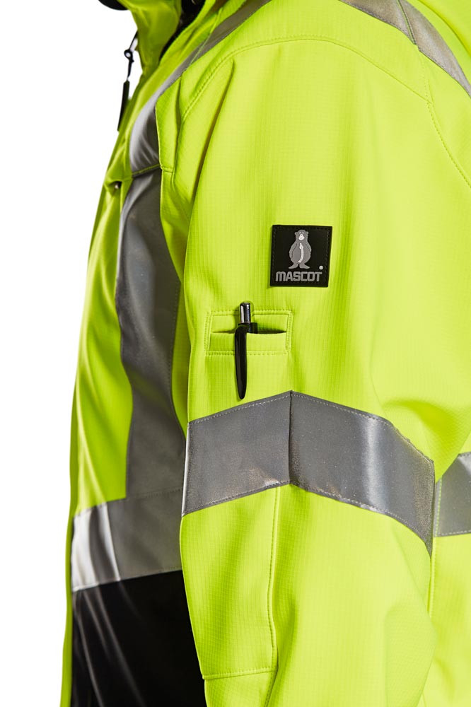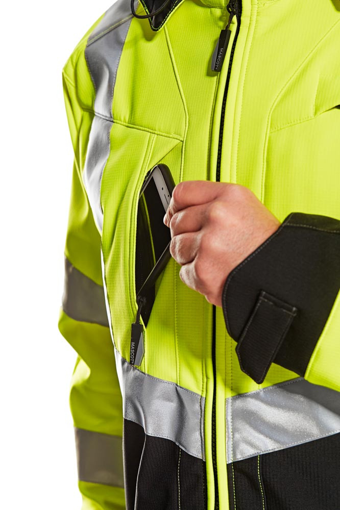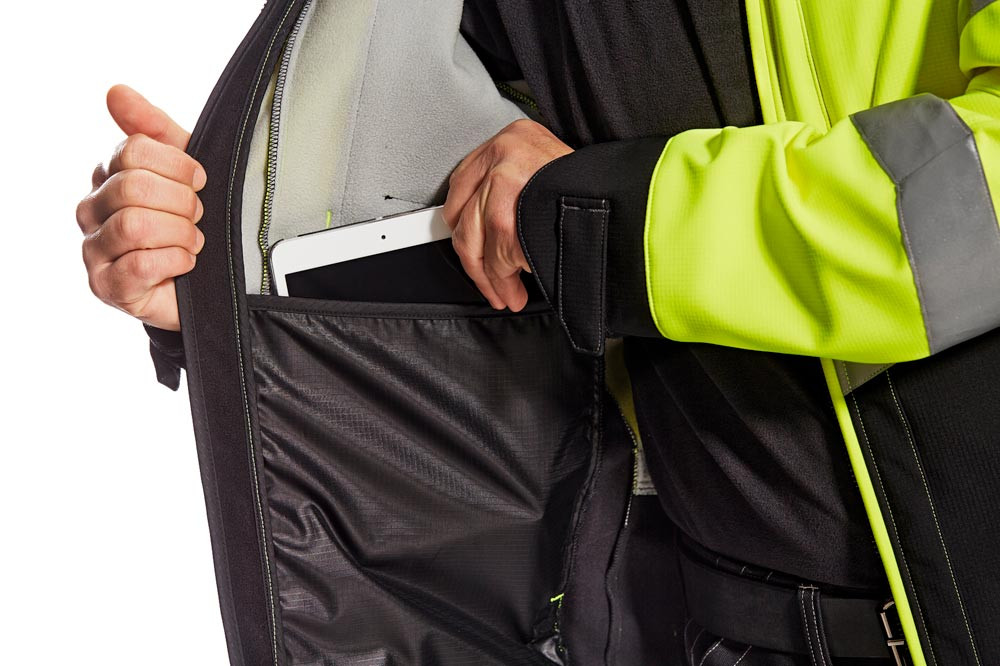 Nach EN ISO 20471 - Klasse 3 (Größe S + M - Klasse 2) und Hi-Vis Gruppe A ∙ Aus 100% Polyester, ca. 360 g/m2 ∙ Atmungsaktiv, winddicht und wasserabweisend ∙ Fleece an der Innenseite ∙ Verschluss mit Reißverschluss und inwendiger Wetterschutzleiste ∙ Kapuze ist abnehmbar, gefüttert und mit verstellbaren Elastikschnüren versehen ∙ Stehkragen ∙ Innentaschen ∙ Reißverschlussinnentasche speziell für Handys entwickelt, mit Öffnung sowie Schlaufen für das Kopfhörerkabel ∙ Rücken ist verlängert ∙ Brusttasche mit Reißverschluss ∙ D-Ring ∙ Stifttasche ∙ Ergonomisch geschnittene Ärmel ermöglichen hohe Bewegungsfreiheit ∙ Rippenbündchen (verdeckt unter der Wetterschutzleiste) an den Handgelenken ∙ Manschetten mit Verstärkungen aus CORDURA®-Gewebe und Klettverschluss ∙ Vordertaschen mit Reißverschluss ∙ Für Industriewäsche-Kategorie C2 geeignet ∙ Zertifiziert nach OEKO-TEX® Standard 100