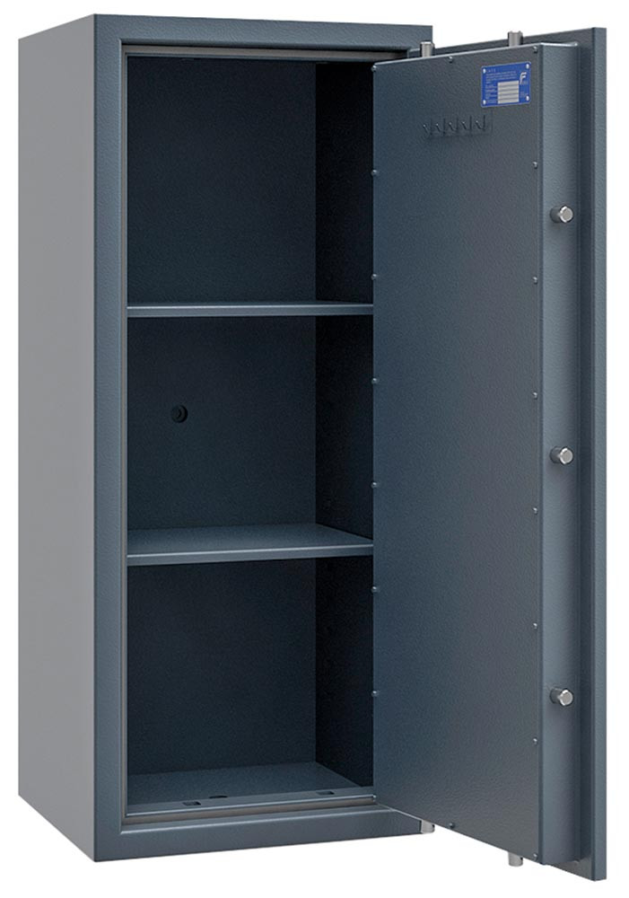 ∙ Leichte Ausführung mit Widerstandsgrad I nach EN 1143-1, ECB*S zertifiziert ∙ Hoher Einbruchschutz durch allseitig mehrwandigen Korpus und mehrwandige Tür, 80 mm stark ∙ Verankerung durch eine Bohrung am Boden vorbereitet ∙ Verriegelung erfolgt über ein Doppelbart-Hochsicherheitsschloss VDS-Klasse I mit 2 Schlüsseln ∙ Beschläge und Scharniere 50 mm vorstehend ∙ Hochwertige Feuerschutzisolierung ∙ Inkl. Verankerungsmaterial ∙ Lackierung RAL 7035 lichtgrau oder RAL 7024 graphitgrau